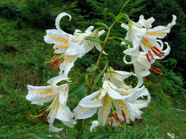 最近は大柄な園芸種のユリに人気があるが、山ではやはり橙色のクルマユリとこの大柄なヤマユリが存在感があり松前半島の福島町、松前町が自生の北限ともいわれています。食用にもなって盗掘も多いといわれていますが、近年のエゾシカ増でエゾシカに食べられています。ここは渡島福島町の森林公園(全国ヤマユリサミット会場)ですが食害に遭った株は2000株に及ぶといわれています。今年は管理人さんによると子鹿が多く食べているそうです。この日は子鹿には会えませんでしたがエゾタヌキが園内を歩いていました。森林公園ではこの時期ヤマユリのほかアジサイも多く開花して、その競演を見に全道各地から愛好家が訪れるそうです。